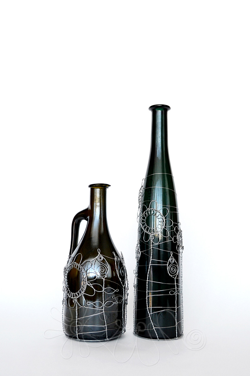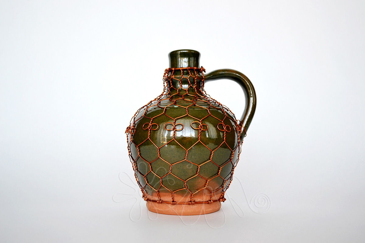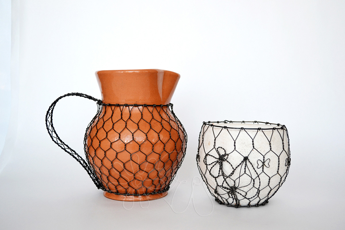 Moje prvé drotárske kroky sprevádzal medený drôt. Je mäkký, tvárny a má veľmi pekné odtiene farieb. Práve jeho mäkkosť ma priviedla k opletaniu rôzne tvarovaných nádob rastlinným motívom. Navzájom previazané hlávky kvetov, listy, úponky umožňujú vytvoriť okolo tela nádoby pevnú a zároveň veľmi dekoratívnu sieť. Niektoré moje staršie práce predstavujem aj v galérii s názvom Archív.